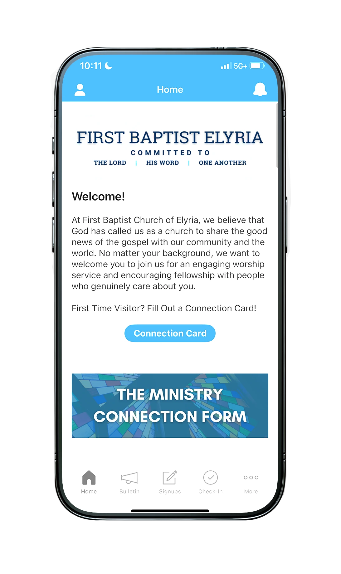The Church Center App is the easiest way to stay connected with First Baptist Church of Elyria. Access events, secure online giving, weekly digital bulletins, facility requests, and forms—all in one place.